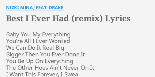 Best I Ever Had Remix is the eleventh track on Nicki Minajs third mixtape Beam Me Up Scotty. Lyrics to Best I Ever Had by Nicki Minaj. We can do it real big. Other hoes aint never on it. After releasing several mixtapes and building substantial buzz online her debut album Pink Friday was released on November 22 2010In October 2010 Minaj. The song features both sampled and original vocals by rapper Drake. You be up on everything.