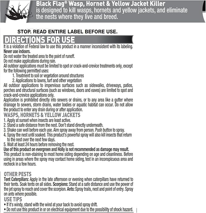 Black flag wasp spray. With formulas that act fast and never back down Black Flag insect controls have been arming homeowners in the battle against invading bugs for more years than any other brandBlack Flag Foaming Wasp Hornet Killer aerosol spray delivers a blanketing foam to kill wasps hornets and yellow jackets by contact. Avoid any wasps that fall from the nest after treatmentNever attempt to spray individual wasps especially when in flight. How many more must die.
