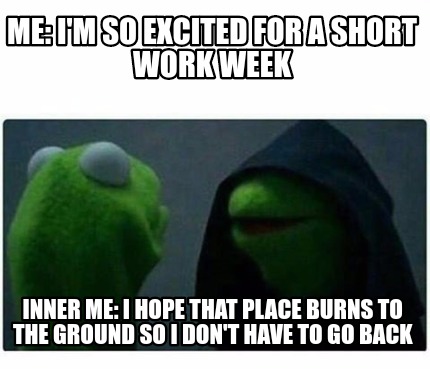 Short work week meme. Memegeneratornet SHORT WORK WEEK WE GOT. Holiday short work week meme. The textual content of this image is harassing me or someone I know.